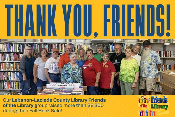 The Friends of the Lebanon-Laclede County Library is a not-for-profit organization whose purpose is to stimulate the use of the Library resources and services; to assist the Library in developing services and facilities for the community; to focus positive public attention to the Lebanon-Laclede County Library and to develop support for the Library in the local community, county and state as appropriate; to maintain an association of persons interested in the Library; to encourage gifts, endowments and bequests to the Library; to facilitate and assist the Library in its informational, educational, cultural and recreational endeavors. The Friends of the Lebanon-Laclede County Library also will sponsor events in the Library, or on behalf of the Library, including fund-raising events.